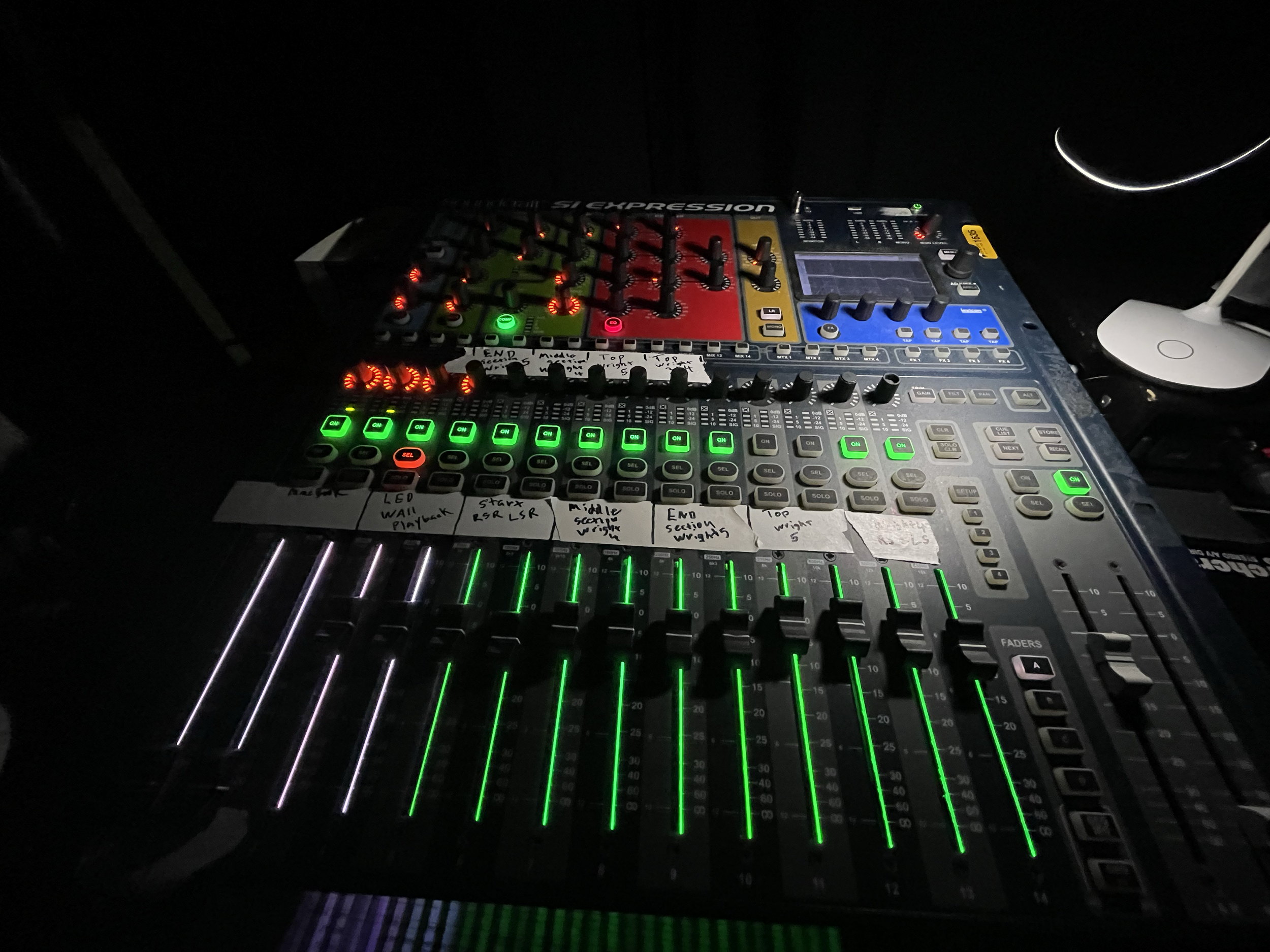 Back stage Soundcraft si expression was used as console for Dolby Atmos playback & routing to three separate 5.1.4 sections.